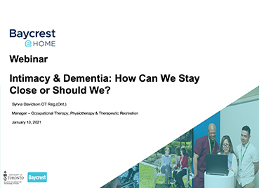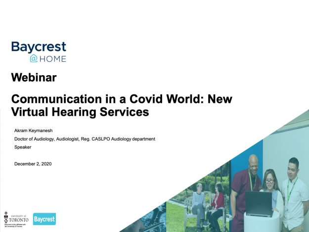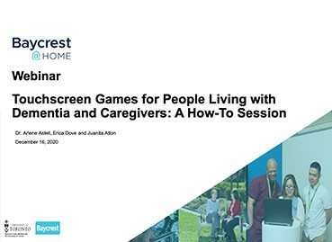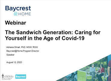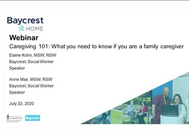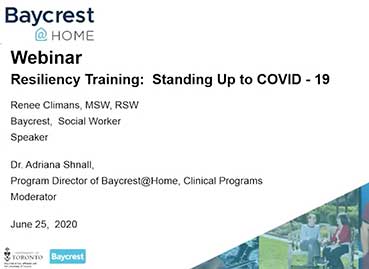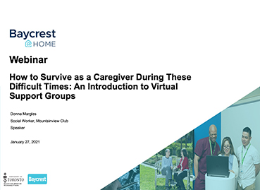 This presentation explores the positive impact of virtual support groups during difficult times. Learn from members of a Baycrest-led virtual support group that regularly meets throughout the current COVID-19 pandemic, and how it helped them navigate and cope with the new normal. This webinar will be followed by a Q&A session.
